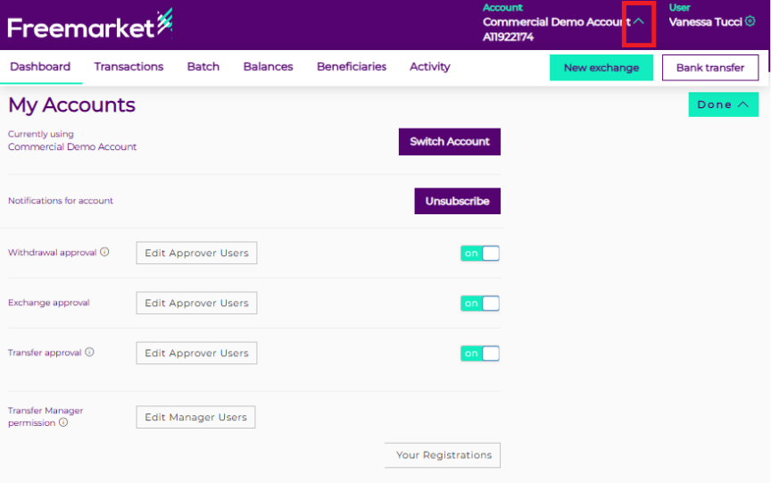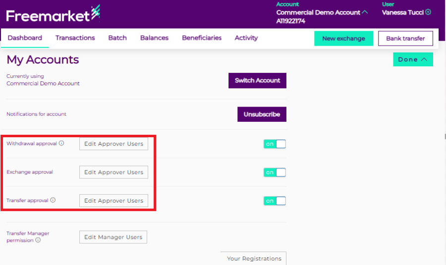 By default, each account only requires one user with the appropriate permissions to execute transactions. However, the platform offers an additional layer of security for processing transactions. This can be applied to withdrawals, transfers, and standard exchanges.