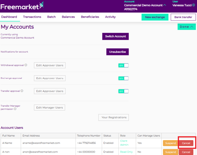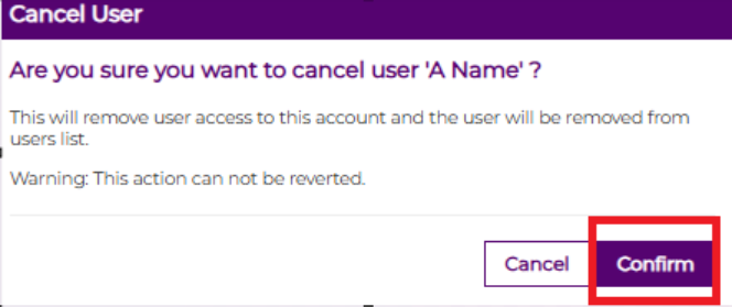 - Identify and select the specific user you would like to suspend and click on “Cancel” on the right side of the page.