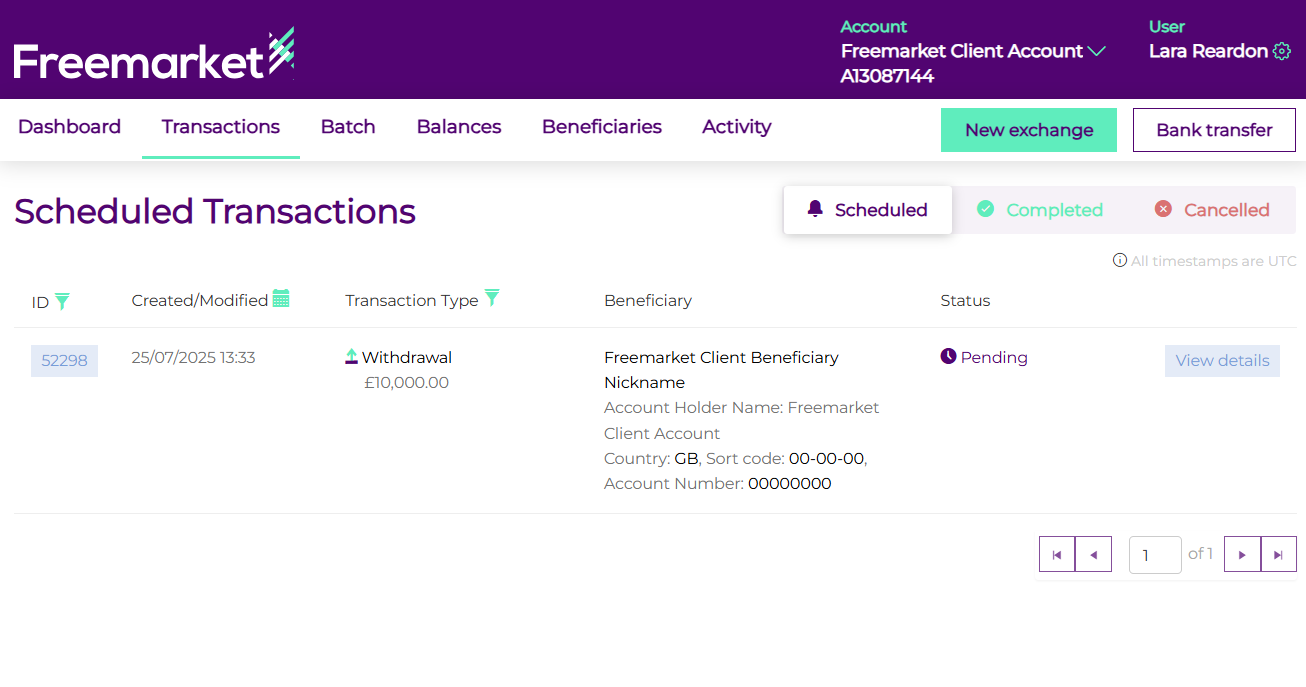To view your payment activity, log in to your Freemarket account and go to the Transactions tab. Here you will be able to see all payments and exchanges, including those that are scheduled, pending, completed and cancelled.