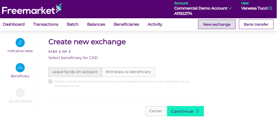 - Leave funds on account → click “Continue” and review the exchange status in the Transaction tab.