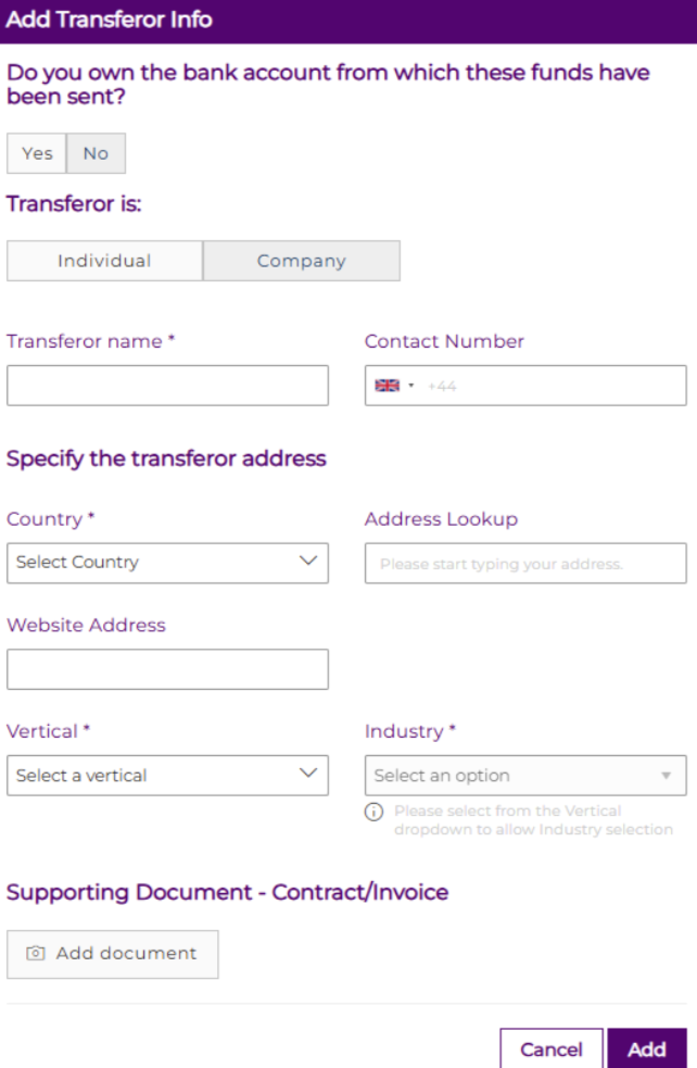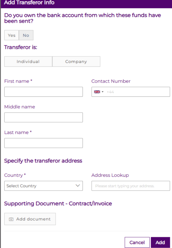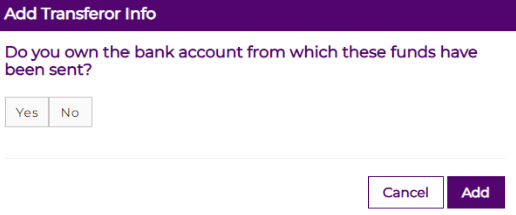 The portal will then prompt you to indicate whether you are the owner of the bank account from which the funds were sent.